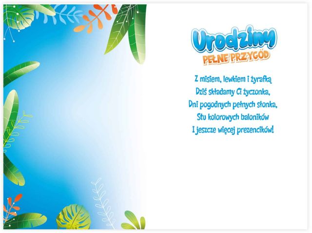 ✔ Wnętrze: barwne, z rymowanymi życzeniami pełnymi radości i przygód.