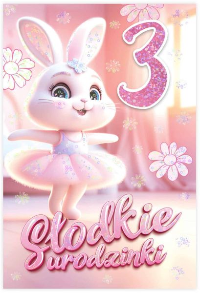 Urocza kartka urodzinowa z motywem króliczki baletnicy to idealny wybór na trzecie urodziny dla dziewczynki! Delikatna różowa kolorystyka, połyskująca cyfra „3” oraz słodkie kwiatowe detale tworzą bajkową kompozycję, która zachwyci każdą małą solenizantkę. Kartka wykonana jest z wysokiej jakości papieru i ozdobiona błyszczącą folią metaliczną, dzięki czemu wygląda niezwykle elegancko i efektownie.