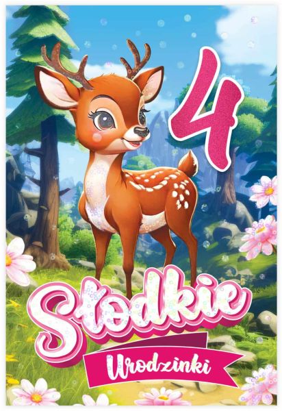 Przepiękna kartka urodzinowa z uroczym jelonkiem to idealny wybór na czwarte urodziny dla dziewczynki! Leśny krajobraz, pastelowe kwiatki i błyszcząca cyfra „4” nadają jej bajkowego charakteru. Kartka została wykonana z wysokiej jakości papieru i ozdobiona połyskującą metaliczną folią, dzięki czemu wygląda elegancko i przyciąga uwagę – idealna jako dodatek do prezentu lub pamiątka na lata.