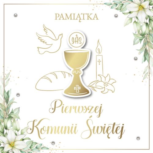 Elegancka kartka na Pamiątkę Pierwszej Komunii Świętej, wykonana w kwadratowym formacie 14x14 cm. Ozdobiona złoceniami oraz przestrzennymi elementami na froncie, co nadaje jej wyjątkowego charakteru. Centralny motyw przedstawia kielich eucharystyczny z hostią IHS, otoczony symbolami sakramentu – gołębicą, chlebem, świecą i kwiatami. Dekoracyjne narożniki zdobione subtelnymi kwiatami oraz błyszczące kryształki sprawiają, że kartka wyróżnia się elegancją i delikatnym blaskiem.