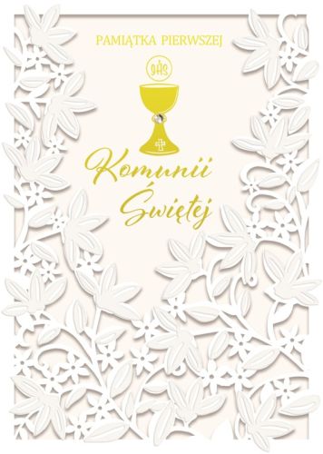 Ekskluzywna kartka na Pierwszą Komunię Świętą w formacie B6, zdobiona precyzyjnie laserowo wycinanym ażurowym wzorem. Delikatny, florystyczny motyw otacza centralny element z symbolem złotego kielicha z hostią, ozdobionego błyszczącym kryształkiem. Eleganckie złocenia oraz przestrzenny efekt wycinanki nadają kartce wyjątkowego charakteru. Wewnątrz znajduje się miejsce na życzenia oraz dane uroczystości, co czyni ją idealną pamiątką tego ważnego dnia.