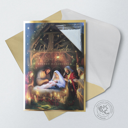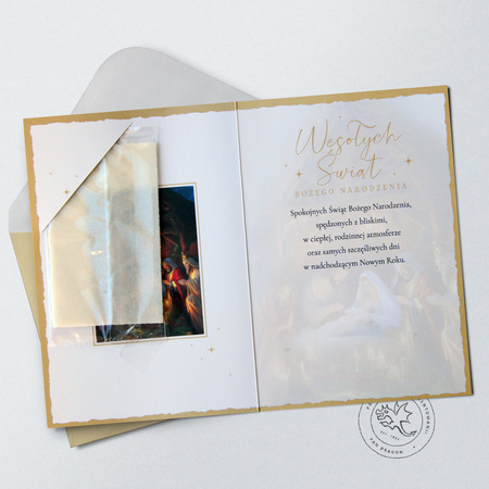 Producent: Pan DragonŚwiąteczna kartka z opłatkiem w zestawie.Kartka jest zdobiona złotą folią.