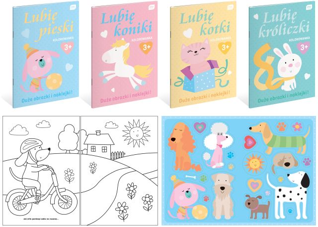 Producent: InterdrukFormat: A4. Liczba kartek: 16. Okładka pokryta błyszczącym lakierem. Seria czterech książeczek z kolorowankami przeznaczona dla dzieci powyżej 3 lat. Duże naklejki w zestawie. Tytuły dostępne w serii: „Lubię Koniki”, „Lubię Króliczki”, „Lubię Kotki”, „Lubię Pieski”.