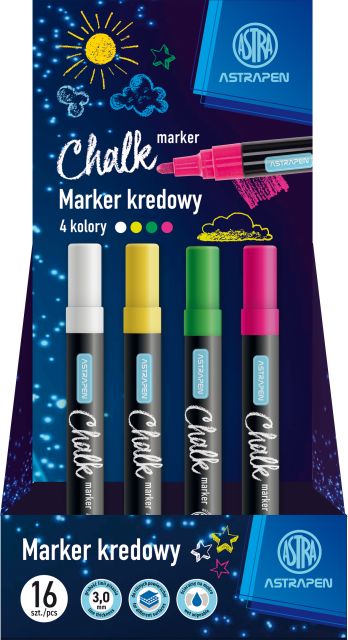 Strona główna » Oferta » Kredki, Kreda, Pastele » Kreda I Markery Kredowe » Markery Kredowe » Marker kredowy okrągły ASTRAPEN - 16 szt. display