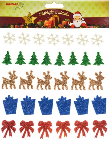 Producent: BrewisMiękkie i kolorowe świąteczne naklejki z pianki - prezenty, renifery, kokardki, płatki śniegu - 33szt. Idealne do świątecznych dekoracji.