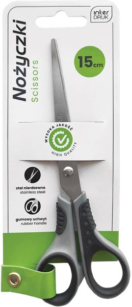 Producent: Interdruk GalanteriaPoręczne nożyczki o długości 15 cm. Precyzyjne ostrze wykonane ze stali nierdzewnej. Gumowy uchwyt zapewnia komfort użytkowania.