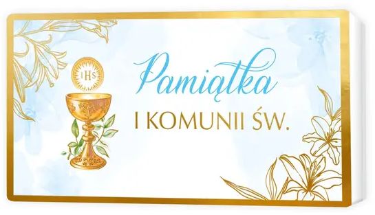 Na froncie znajduje siê kielich z hosti± oraz napis „Pierwsza Komunia ¦wiêta” wykonany z³ot± foli±. Z³ocona ramka oraz subtelne zdobienia ro¶linne dodaj± ca³o¶ci lekko¶ci i estetyki, dziêki czemu produkt wyró¿nia siê na tle bardziej klasycznych wzorów.