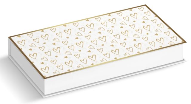 Ozdobne pudełko PD to stylowy i estetyczny sposób na wręczenie banknotu, voucheru lub karty podarunkowej w wyjątkowej oprawie. Klasyczna forma została wzbogacona delikatnym wzorem złotych serduszek, który nadaje całości subtelny, elegancki i bardzo uniwersalny charakter. Jasne tło w połączeniu ze złotymi zdobieniami sprawia, że pudełko prezentuje się lekko, efektownie i pasuje do wielu okazji.