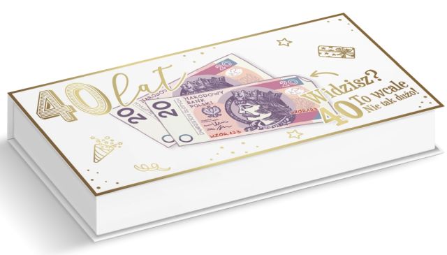 Na wieczku znajduje się dekoracyjny napis „40 lat” oraz motyw banknotów, który od razu podkreśla charakter upominku. Całość uzupełnia zabawny tekst „Widzisz? To wcale nie tak dużo”, dzięki czemu pudełko idealnie wpisuje się w klimat jubileuszowego prezentu. Złocone elementy i subtelne ozdobniki dodają mu elegancji, a całość doskonale sprawdza się jako opakowanie na pieniądze na 40 urodziny.