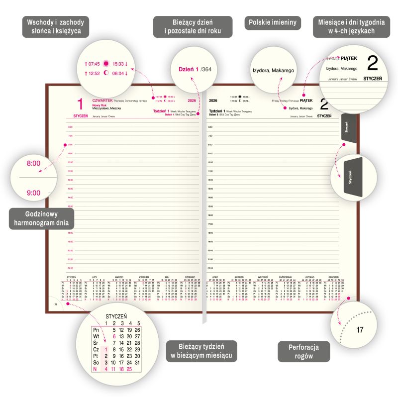 ✔ Dodatkowe strony: notatki, telefony, skorowidz alfabetyczny, daty świąt i imienin.