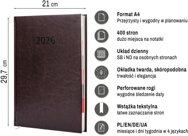 Terminarz dzienny Agenda w formacie A4 (204x295x22 mm) to idealne narzędzie dla osób, które cenią najwyższy poziom organizacji, elegancję i profesjonalizm. Dzięki połączeniu klasycznego designu z funkcjonalnością, kalendarz doskonale sprawdzi się w biurze, gabinecie czy w codziennym użytkowaniu przez osoby, które muszą mieć wszystkie sprawy pod pełną kontrolą.