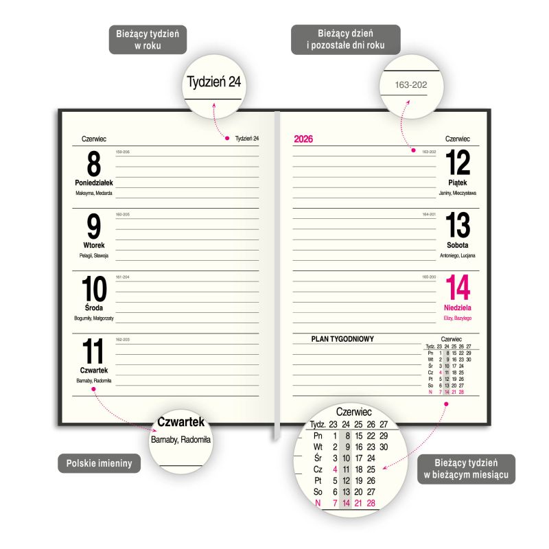 ✔ Dodatkowe strony: notatki, telefony kierunkowe, skorowidz alfabetyczny, daty świąt i imienin.