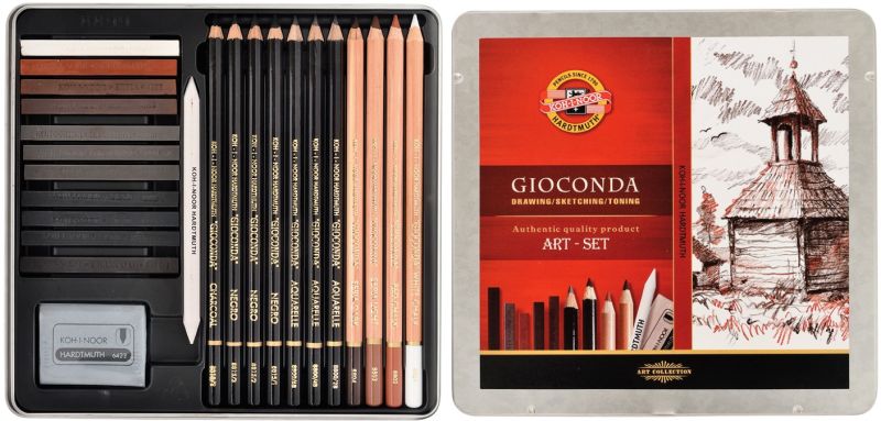 Artystyczny zestaw prezentowy Gioconda spakowany w elegancką, metalową kasetkę. Zestaw przeznaczony jest dla artystów oraz hobbystów. Charakteryzuje się wysoką jakością produktów.