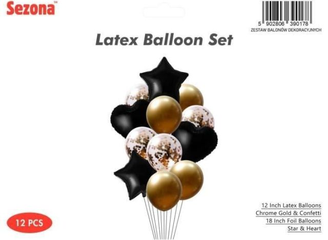 Zestaw Balonów Dekoracyjnych Sezona – Złoto, Czerń i Konfetti – 12 sztuk Eleganckiego Blasku!