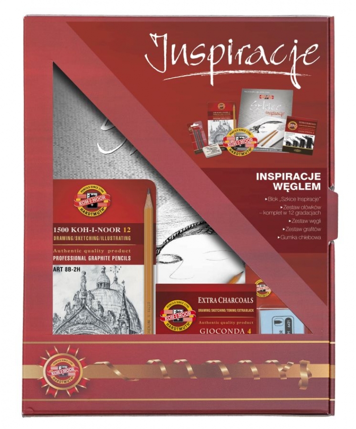 Producent: Koh-I-NorW skład zestawu wchodzą: - zestaw ołówków 1502/II - grafit w sztyfcie 4390/2B/bl - zestaw węgieli prasowanych 8694 - gumka - blok „szkice inspiracje“